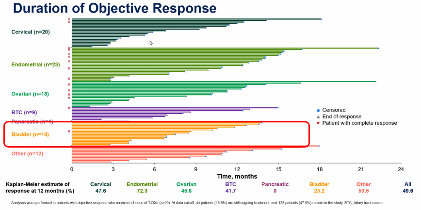 DPT-02研究纳入了41例至少经过≥2线治疗的晚期尿路上皮癌患者,HER2 IHC 2+和3+的患者分别为20例、16例。结果显示,整体ORR为39.0%(独立中心评估为41.5%),其中在HER2 IHC2+和3+患者中,ORR分别为35.0%和56.3%(出现了1例完全缓解),12周的疾病控制率(DCR)为70.7%,中位缓解持续时间(DOR)为8.7个月(4.3-11.8),有23.2%的患者出现了12个月的反应率。