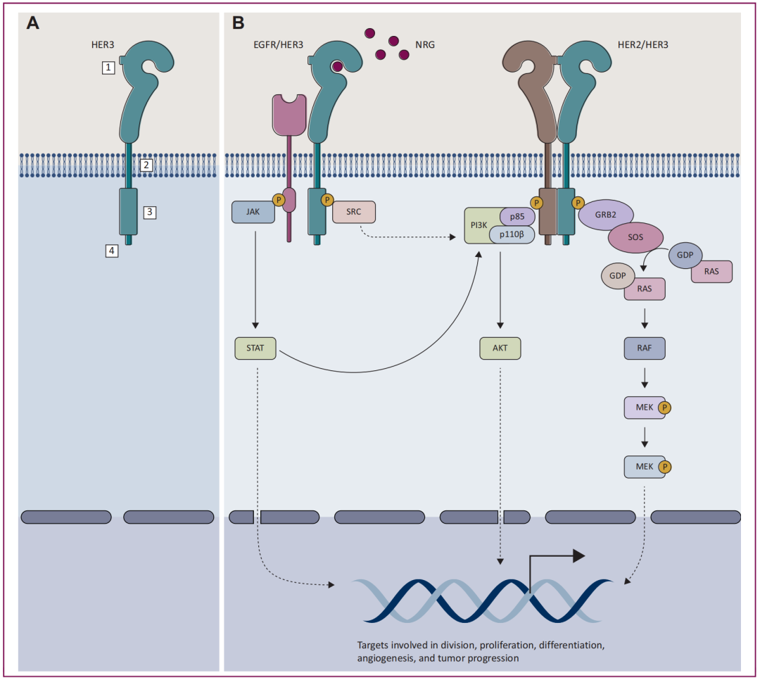 如下图所示,单体形式的HER3处于失活状态,但与配体NRG(神经调节蛋白)结合后发生构象变化,并与EGFR或HER2形成异源二聚体。随后,胞内结构域的酪氨酸激酶活性增强,启动不同的下游信号通路级联反应,包括PI3K/AKT、MAPK、JAK/STAT和SRC等信号通路;促进细胞分裂、增殖、分化以及血管生成等,导致肿瘤发生、发展和耐药性增加[2-3]