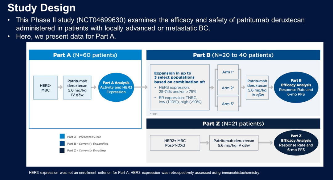 这项研究的A部分入组患者为HER2-晚期乳腺癌,其中HR+患者既往接受过0-2线化疗和内分泌+CDK4/6抑制剂治疗;TNBC患者接受过1-3线化疗。研究的主要终点是ORR和6个月无进展生存(PFS)率。