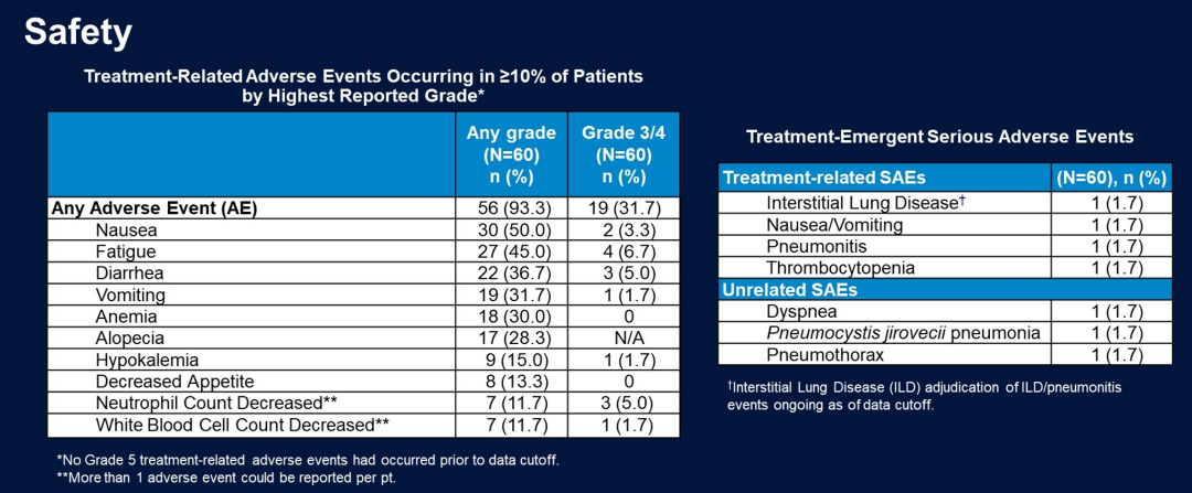 在安全性方面,93%的患者发生了治疗相关不良事件(TRAEs),其中≥3级TRAEs发生率为32%;最常见的任何级别TRAEs为:恶心(50%)、疲劳(45%)、腹泻(36.7%)、呕吐(31.7%)、贫血(30%)、脱发(28.3%)。7例患者(12%)发生严重不良事件(sAE),其中4例(7%)为治疗相关的sAE(间质性肺病、恶心/呕吐、非感染性肺炎、血小板减少症各1例)。有15%的患者发生剂量减少,23%的患者发生治疗中断。3例患者在治疗期间死亡,2例与治疗无关,1例原因不明。