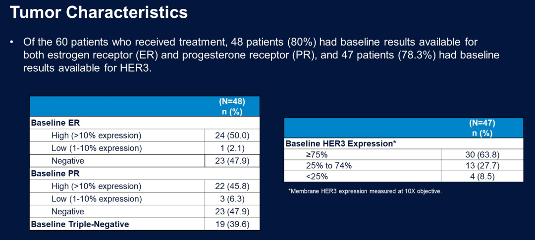 该研究的A部分共入组60例患者,中位年龄59岁,既往中位治疗线数为3(范围:1-9);32%的患者为TNBC,48%为HR+;48%存在肝转移,32%存在肺转移。在47例有基线样本的患者中,63.8%(30/47)存在HER3表达≥75%,27.7%(13/47)的HER3表达水平为25%~74%,8.5%(4/47)的HER3表达水平<25%。中位持续治疗时间为5.2个月,至数据截止时仍有21例患者正在接受治疗。