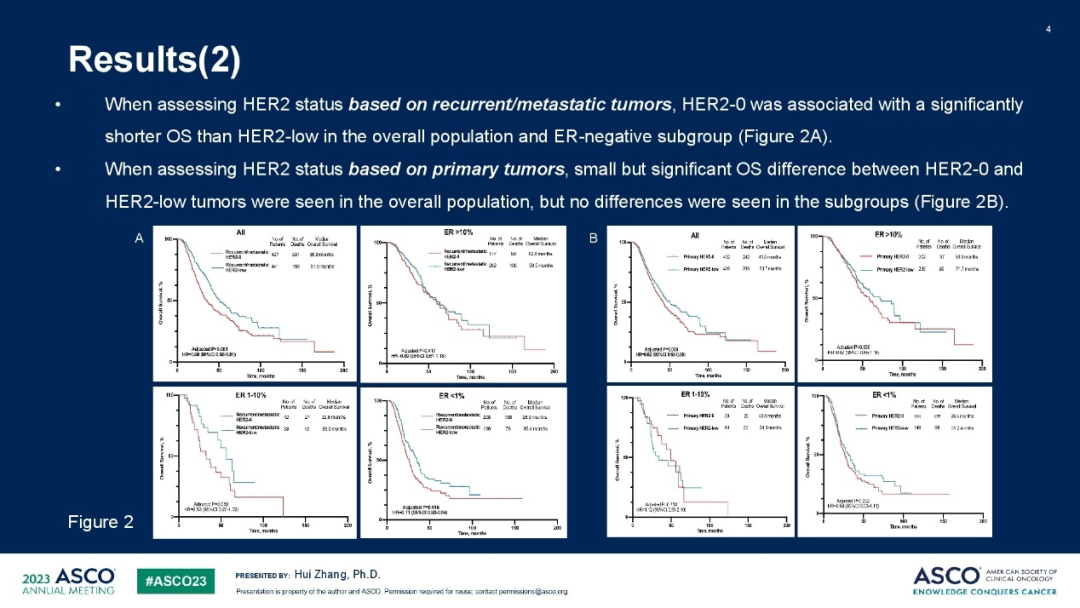 在转移/复发性乳腺癌人群中,总人群及雌激素受体(ER)阴性亚组人群HER2低表达患者较HER2 IHC 0患者总生存期(OS)更长;在原发性乳腺癌人群中,总人群HER2低表达患者较HER2 IHC 0患者OS更长,亚组间并无显著差异。