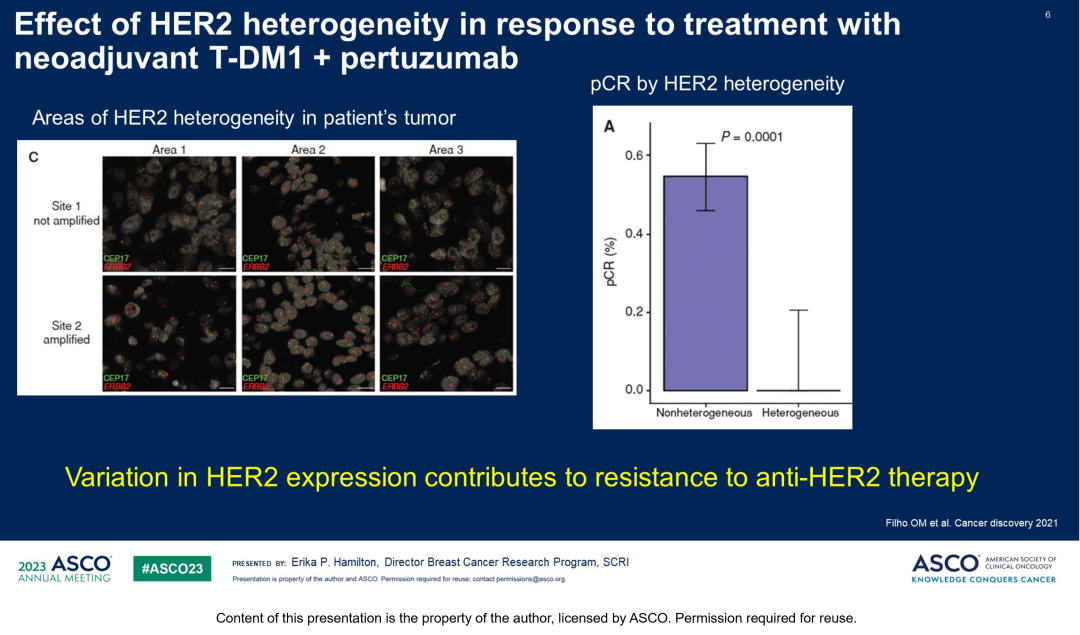 已有研究证实,在抗HER2治疗过程中,HER2表达降低会造成对T-DM1的耐药。T-DM1联合帕妥珠单抗新辅助治疗对存在HER2异质性肿瘤患者的完全病理缓解率(pCR)甚至可低至0%,与不存在异质性患者具有显著差异(P=0.0001)。