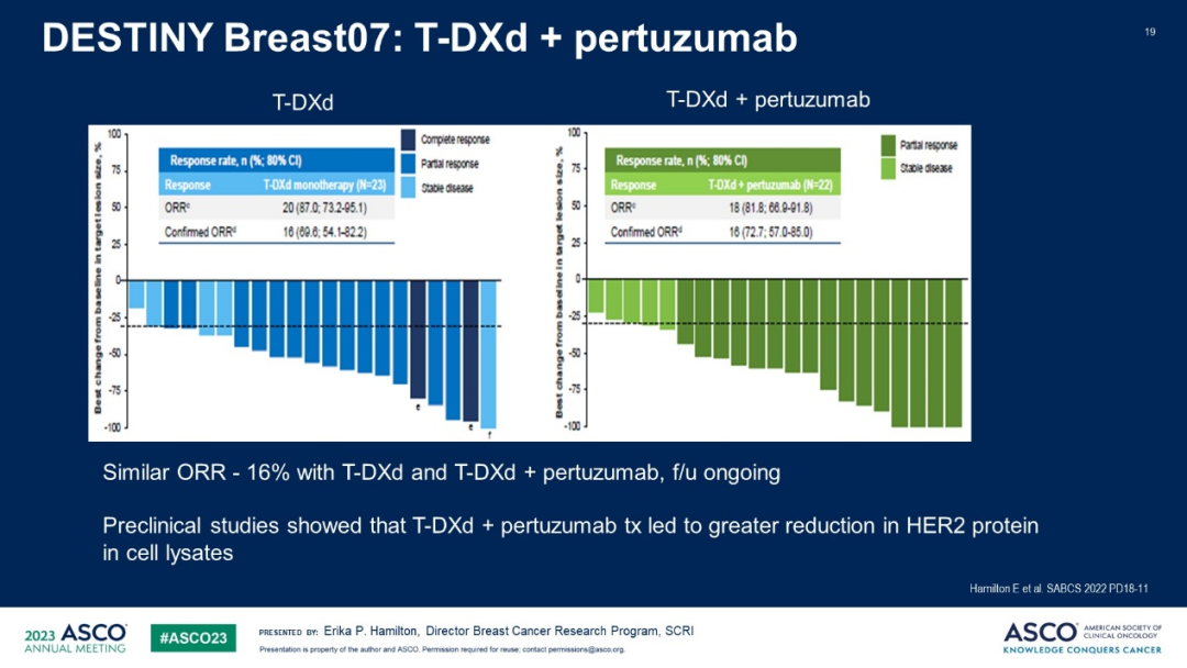 DESTINY-Breast 07研究中,T-DXd联合帕妥珠单抗与单药T-DXd均取得了16%的客观缓解率(ORR),进一步的分析结果值得期待。