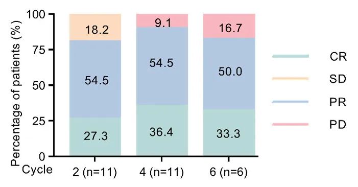 疗效数据:11例患者进行了疗效评估(见图1),结果表明,2周期POR结束时ORR/CRR为81.8%/27.3%,4周期POR结束时ORR/CRR为90.9%/36.4%。中位随访4个月仅1例患者复发,中位PFS和OS均未达到。