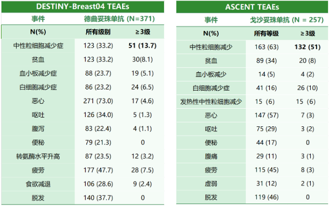 在安全性方面:T-DXd与SG的主要不良反应均为血液学毒性。在DESTINY-Breast04研究中,T-DXd≥3级的中性粒细胞减少发生率为13.7%、贫血8.1%、血小板减少5.1%16;在ASCENT研究中,SG≥3级的中性粒细胞减少发生率为51%、贫血8.0%、血小板减少2.0%、发热性中性粒细胞减少为6%17