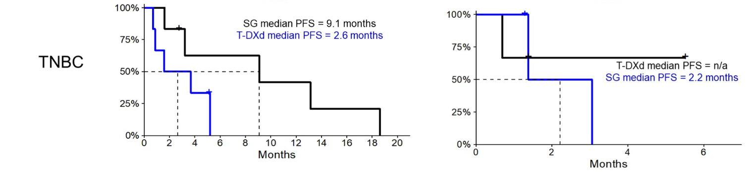 2023年ASCO年会中,哈佛医学院麻省总院肿瘤中心对“ADC after ADC”展开了论证18。该研究纳入了35例接受≥2个ADC治疗的晚期乳腺癌患者,其中HR+/HER2-患者15例,TNBC 20例,HER2低表达24例。在TNBC亚组中,先用SG再用T-DXd:SG mPFS为9.1个月,T-DXd mPFS为2.6个月;先用T-DXd再用SG:T-DXd mPFS为未达到,SG mPFS为2.2个月。从而提示了在TNBC HER2低表达人群中优选T-DXd具有更大的获益趋势。
