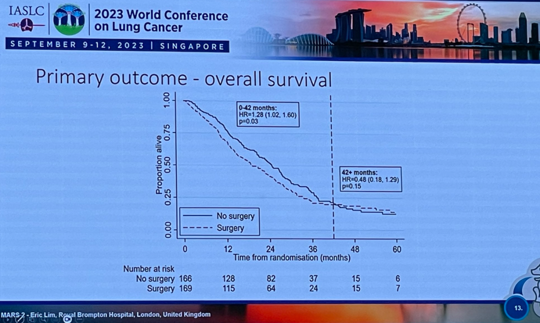 编者按:根据2023年世界肺癌大会(WCLC)发布的胸膜切除术联合化疗与单独化疗的首次直接比较结果,手术使随机后前42个月内的死亡风险增加,也导致更多的严重不良事件,并降低患者的中位生存期(OS)和生活质量,增加医疗费用。这项英国多中心随机试验MARS 2由英国皇家布朗普顿医院Eric Lim教授的团队开展,研究了手术联合化疗vs单独化疗对间皮瘤患者的影响(摘要号PL03.10)。