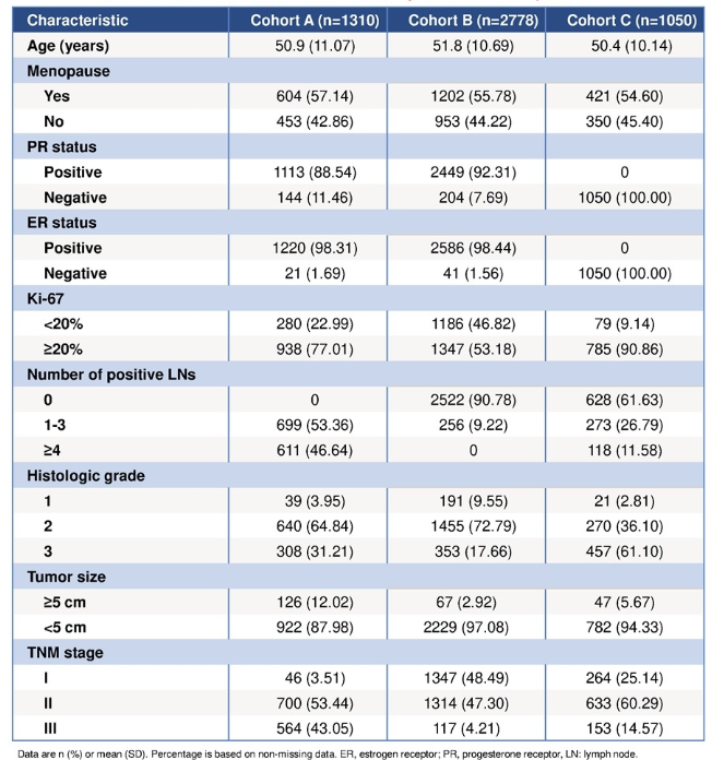 本研究数据库是基于中国50家主要医院的电子病例记录,且该数据库通过国家死亡登记系统获取患者死亡信息。研究包括自2013年1月1日至2021年3月31日期间接受乳腺癌根治手术和辅助内分泌治疗的HR+/HER2-,Ⅰ-Ⅲ期早期乳腺癌患者。基于临床病理特征来划分患者风险,并构建研究队列。“高风险队列”患者需满足:≥4个阳性腋窝淋巴结,或1-3个阳性腋窝淋巴结并具有以下高风险临床病理特征至少之一:肿瘤组织分级3级、肿瘤大小≥5厘米或Ki-67≥20%;“低风险队列“为不符合上述标准的患者。临床结局包括对无浸润性疾病生存期(iDFS),无远处复发生存期(DRFS)和总生存期(OS),统计分析截止日期为2021年9月30日。