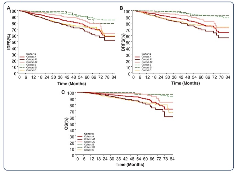 图1.早期乳腺癌IDFS、DRFS和OS的Kaplan-Meier曲线