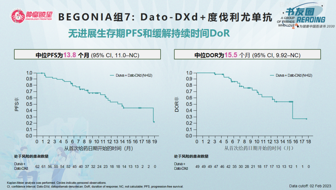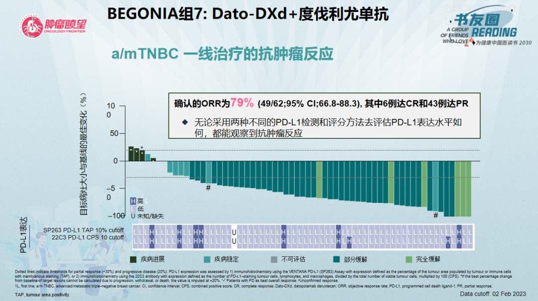 截至2023年2月2日,中位治疗11.7个月,队列7共62例患者接受Dato-DXd+度伐利尤单抗治疗[33例(53%)停止治疗,29例(47%)患者仍在继续接受治疗],确认的ORR为79%(49/62;95%Cl:66.8~88.3),其中6例达CR,43例达PR,无论采用两种不同的PD-L1检测和评分方法去评估PD-L1表达水平如何,都能观察到抗肿瘤反应。