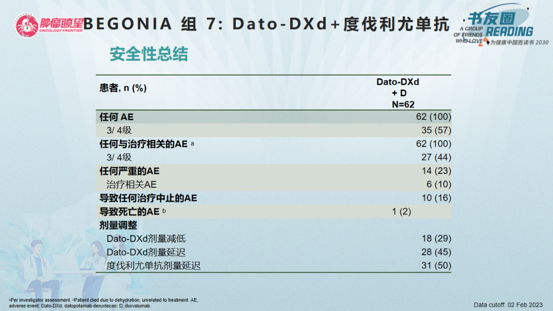 安全性方面,最常见的AE为胃肠道AE,通常级别较低。35例(57%)患者发生任何3/4级AE,14例(23%)患者发生严重AE。贫血(15%)、腹泻(13%)和中性粒细胞减少(5%)的发生率较低。仅有3例(5%)患者发生了1/2级与治疗相关的间质性肺疾病/肺炎,无与治疗相关AE的死亡病例。Dato-DXd联合度伐利尤单抗具有可耐受和可管理的安全性特征,无新的安全性信号。