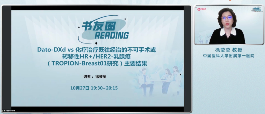2023年10月27日19:30,辽宁省肿瘤医院孙涛教授(主持)与中国医科大学附属第一医院徐莹莹教授(讲者)、中国科学院大学附属肿瘤医院(浙江省肿瘤医院)郑亚兵教授(讲者)共同做客《书友圈》,对2023 ESMO大会乳腺癌领域靶向Trop-2的ADC(DATO-DXd)的最新进展进行了介绍。