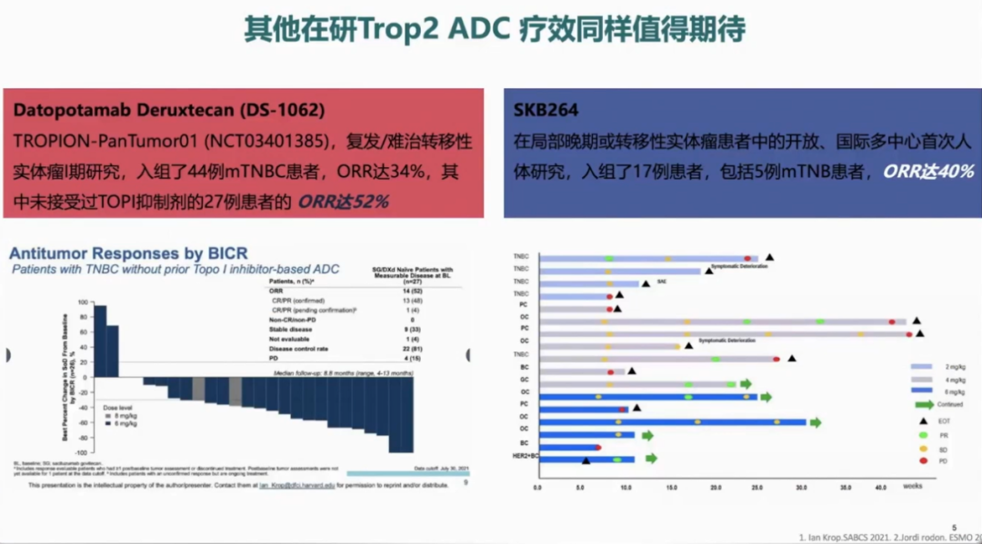 SG(Sacituzumab Govitecan)是一种靶向Trop-2的ADC,关键性Ⅲ期ASCENT研究数据显示,既往接受过二线以上标准化疗的mTNBC患者,SG相比医生选择的单药化疗(TPC)显著改善患者的PFS和OS。DS-1062、SKB264等其他在研的靶向Trop-2 ADC疗效也同样值得期待。
