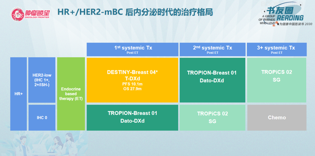讲课最后,徐莹莹教授对HR+/HER2-晚期乳腺癌患者后内分泌时代的治疗格局进行了介绍。她提到,基于DB-04的数据,对于HER2低表达患者推荐用T-DXd进行治疗。对于HER2 0的患者,Trop-2的ADC是HR+/HER2-晚期乳腺癌患者的优选治疗选择,从入组人群来看,TROPION-Breast01研究治疗线数更靠前。在快速迭代的药物治疗浪潮下,应根据患者既往的治疗史及要选择药物的不良反应情况等相关因素为患者进行精准化的治疗选择。