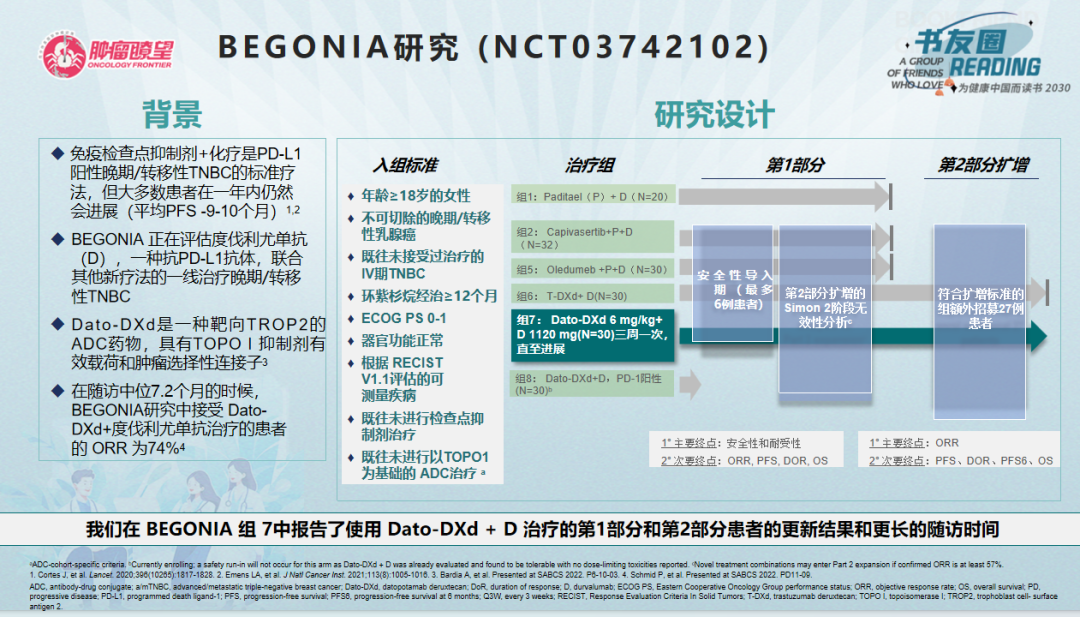 BEGONIA是一项正在进行的两部分、开放标签研究,评价了PD-L1抗体度伐利尤单抗联合其他新型疗法(包括ADC类药物:Dato-DXd、T-DXd等)用于晚期/转移性三阴性乳腺癌(a/mTNBC)一线治疗的疗效和安全性。入组人群特征为:≥18岁女性a/mTNBC患者;既往未接受过Ⅳ期疾病治疗;紫杉烷治疗早期疾病后≥12个月;ECOG PS评分0-1分;器官功能完好;根据RECIST v1.1评估;既往未接受过免疫检查点抑制剂和基于拓扑异构酶Ⅰ的ADC治疗。其中,队列7评价了Dato-DXd联合PD-L1抑制剂度伐利尤单抗一线治疗不可切除、局部晚期或转移性TNBC患者的安全性、耐受性和初步疗效。主要终点为ORR,次要终点包括:PFS、DOR、PFS6、OS。