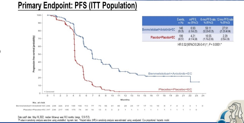而ETER-701研究则探索了四药联合策略,即含铂双药治疗联合安罗替尼并进一步联合贝莫苏单抗治疗广泛期小细胞肺癌的疗效及安全性,这也是第一个探索四药联合治疗策略的III期随对照临床研究。该研究中,符合入组标准的患者,按1:1的比例随机分为含铂双药治疗或在此基础上进一步联合多靶点抗血管生成药物安罗替尼和进一步联合针对PD-L1的免疫检查点抑制剂贝莫苏单抗,研究设置PFS和OS作为共同主要研究终点。在本届世界肺癌大会上公布了四药组相较于含铂双药治疗的疗效及安全性。本次分析时,四药组和含铂双药组分别入组246例和247例患者,脑转移患者占比分别为10.2%和10.5%。最终,两组中位PFS分别为6.93个月和4.21个月,6个月PFS率分别为59.1%和16.6%,12个月PFS率分别为27.9%和2.3%,HR=0.32,P<0.0001。两组中位OS分别为19.3个月和11.9个月,HR=0.61,P=0.0002,12个月OS率分别为64.1%和49.0%,24个月的OS率分别为41.8%和24.2%。PFS和OS的亚组分析中均观察到了四药组相较于双药组更好的获益。两组3度及以上治疗相关不良反应发生率分别为93.1%和87.0%,并分别导致了4.5%和1.6%的患者出现死亡事件,5.7%和2.0%的患者治疗终止,严重不良反应发生率分别为46.7%和34.1%。