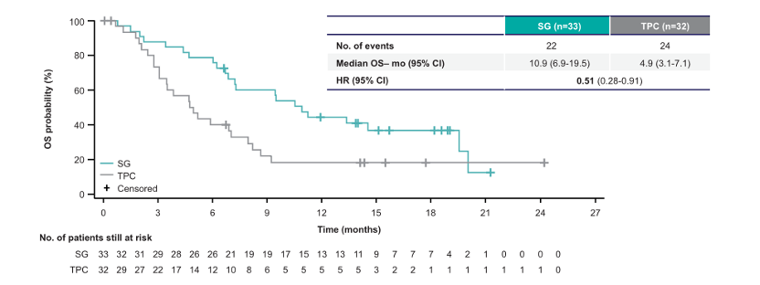 在肿瘤缓解方面,SG组较TPC组客观缓解率(ORR)提升至10倍(30%vs 3%)。其中,SG组中1例患者完全缓解(CR),9例患者部分缓解(PR);TPC组没有患者CR,1例患者PR。SG组临床获益率(CBR)为TPC组的7倍【42%(14/33)vs 6%(2/32)】。由此可见,SG较化疗可改善mTNBC生存状况,为mTNBC二线治疗带来了更优的临床选择。