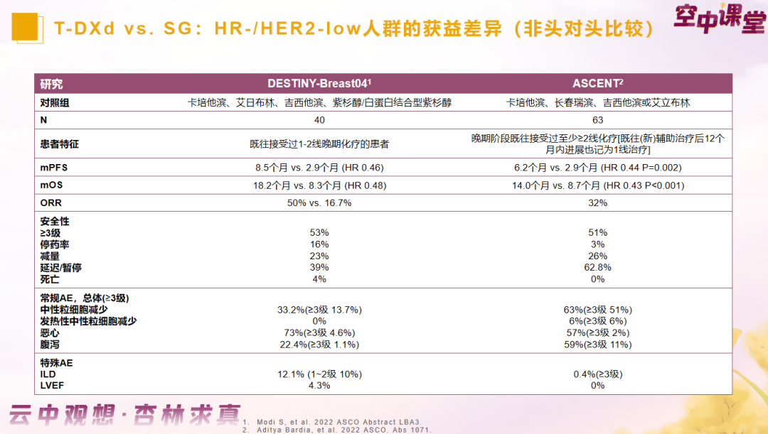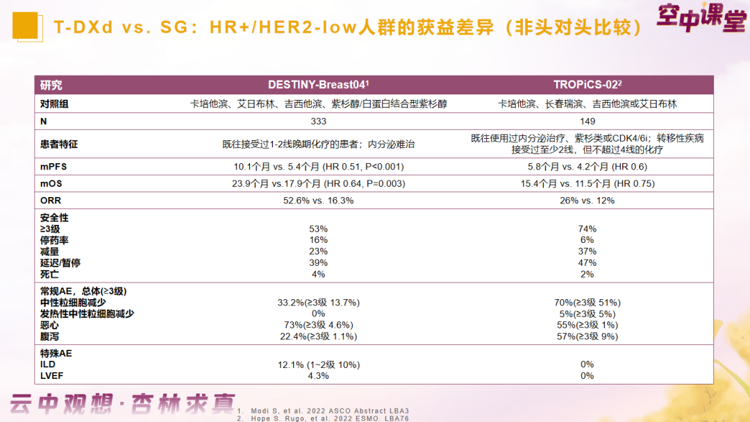 TROPiCS-02是一项SG治疗HR+/HER2-不可手术或转移性乳腺癌的3期试验,入组患者接受过2-4线晚期化疗,已经报道ITT人群的PFS和OS获益。在HER2低表达患者的事后分析中,SG组患者也表现出PFS(5.8 vs 4.2个月,HR=0.60)和OS获益(15.4 vs 11.5个月,HR=0.75),安全性与TROPiCS-02总体安全性人群基本一致[15-16]。