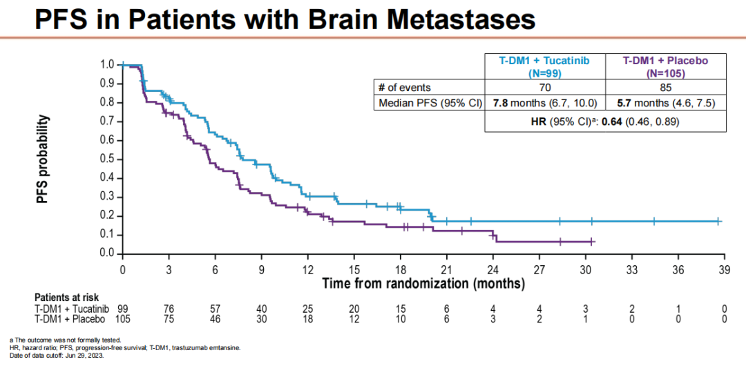 然而,在具有脑转移HER2阳性乳腺癌患者中,与安慰剂+T-DM1组相比,图卡替尼+T-DM1治疗组的PFS获益更好(7.8个月vs 5.7个月,HR 0.64,95%CI:0.46~0.89),但我们并没有对此进行统计学分析。