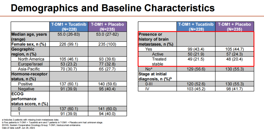 在这项研究中,约一半患者(228例)接受图卡替尼+T-DM1治疗,另一半患者(235例)接受安慰剂+T-DM1治疗。患者既往治疗线的中位数为1,约90%的患者之前接受过帕妥珠单抗治疗。