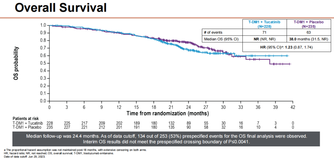 The study showed that progression-free survival was significantly improved in the tucatinib treated patients by about two months with a hazard ratio of 0.76.This statistical significance prompted the first of two interim overall survival analyses.At this time,the survival analysis was immature with only 53%of events,but it was not positive.It did not demonstrate a difference between the two treatment arms.