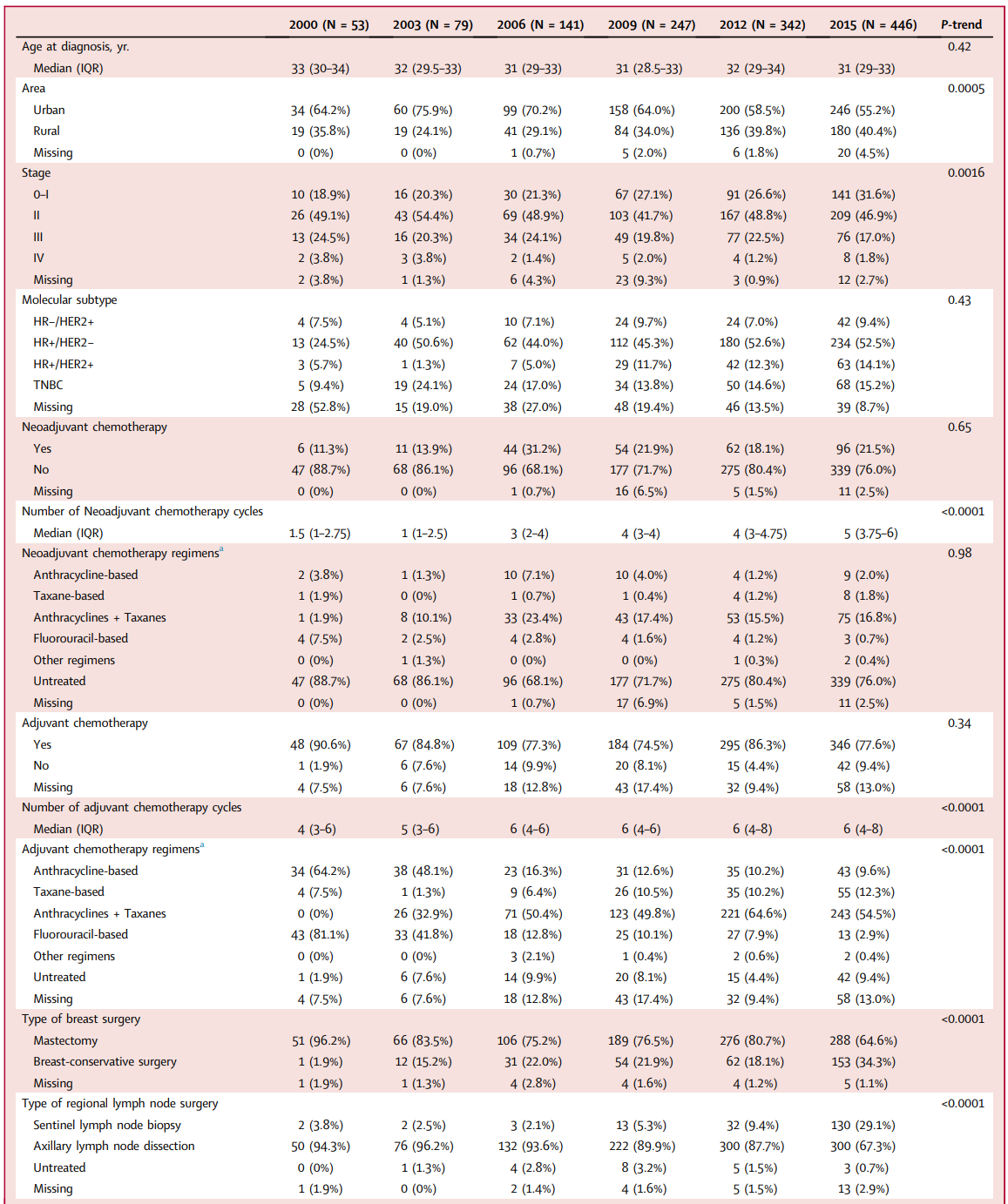 在基于医院的队列中,6个时间段共收集了1,308名年轻乳腺癌患者,其中HR-/HER2+占8.3%、HR+/HER2-占49.0%、HR+/HER2+占11.1%、TNBC占15.3%。在这六个时间段中,患者初诊的中位年龄相似,均为31-33岁。城市患者占比逐年降低,农村占比逐年上升,与总人口趋势一致。0-Ⅰ期确诊病例逐年增加,到2015年已到达31.6%,显示了我国早筛早诊的进步。患者的生存也呈现出改善的趋势,患者的5年DFS率从2000年的45.5%提升到2015年的71.3%,5年OS率暂无显著改变,在87.9%-95.5%之间。