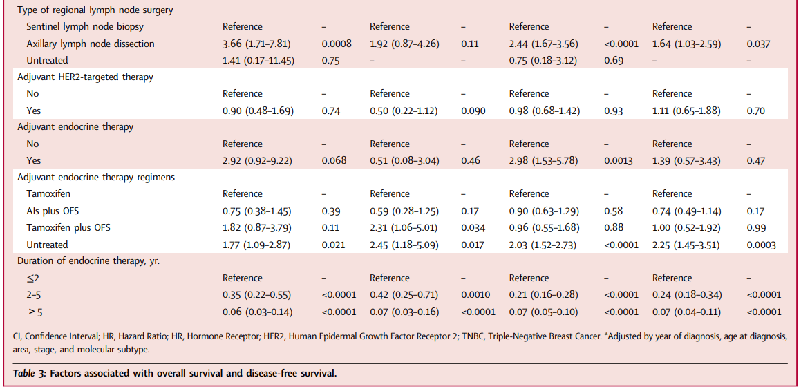 多变量分析显示,我国年轻乳腺癌患者预后与诊断年份、诊断年龄、地区、分期、分子亚型等因素相关。晚期(II、III和IV期)患者死亡和复发风险显著增加。与HR+/HER2-乳腺癌相比,TNBC的死亡和复发风险更高。接受新辅助化疗或腋窝淋巴清扫的患者复发风险也较高。接受4~6周期辅助化疗患者的复发风险低于辅助化疗≤3周期的患者。未接受内分泌治疗的HR阳性患者死亡和复发风险显著增加。与单独使用他莫昔芬相比,他莫昔芬联合OFS的患者死亡风险增加,但复发风险没有增加。接受内分泌治疗2~5年和>5年的患者与<2年的患者相比,死亡和复发风险显著降低。