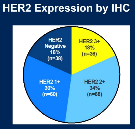 本次ASCO-GU中的一项研究利用纪念斯隆·凯特琳癌症研究中心的MSK-IMPACT平台[4],回顾性地纳入了具有HER2测序数据及HER2免疫组化结果的202例患者,其中168例还具有PD-L1免疫组化结果(图1)。研究发现在HER2基因突变或扩增的比例为22.3%,HER2免疫组化评分为0、1+、2+和3+的比例分别为18.8%、29.7%、33.7%和17.8%(图2);而PD-L1表达CPS评分≥10的比例为48.2%。
