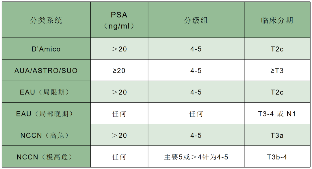 尽管新辅助治疗的理念逐渐被临床所接受,但前列腺癌新辅助治疗仍存在一些挑战[4-5]。首先,目前我们主要选择复发高危的前列腺癌患者进行新辅助治疗,但国内外有关“高危”的定义没有统一标准(如下表)。其次,前列腺癌新辅助内分泌治疗尚缺乏标志物/替代终点。新辅助内分泌治疗后的完全病理缓解(pCR,大约为10%)率仍然较低,达到pCR与未达到pCR的患者生存预后是否有显著差异,目前尚不确定;早期疾病阶段存在去势抵抗性或快速治疗诱导的去势抵抗,都可能导致新辅助治疗的pCR效果不佳,因此也有研究使用最小残存疾病(MRD)等作为前列腺癌新辅助治疗的评价标志物。苟欣教授认为,尽管新辅助治疗研究尚未看到生存获益,但其在病理降期等肿瘤学方面的获益是明确的,未来应该引入更加多维的评价指标,除了短期或远期的疗效指标,还应该包括患者满意度、功能结局和生活质量评估等。