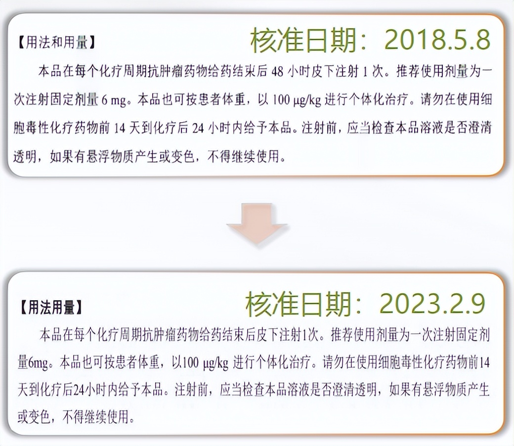 我国首个自主研发的长效PEG-rhG-CSF硫培非格司亭注射液,于2018年5月批准上市,用以降低成年非髓性恶性肿瘤患者易引起FN的感染发生率,为我国肿瘤患者克服长期治疗过程中遇到的血液学毒性提供了有力工具。作为我国自主创新的新一代PEG-rhG-CSF,硫培非格司亭已在中国、美国、日本、印度及欧洲等地获得了发明专利。2023年2月14日,硫培非格司亭获得CDE批准修订说明书,把抗肿瘤药物给药后48小时皮下注射修改为抗肿瘤药物给药后24小时即可使用(图4),为国内首个且唯一说明书规定可在给药后24小时使用的长效G-CSF,可极大地帮助患者减少用药等待时间和成本,减少病床负担,为进一步缩短平均住院日提供了物质条件,有助于更多的肿瘤患者及时就诊治疗。