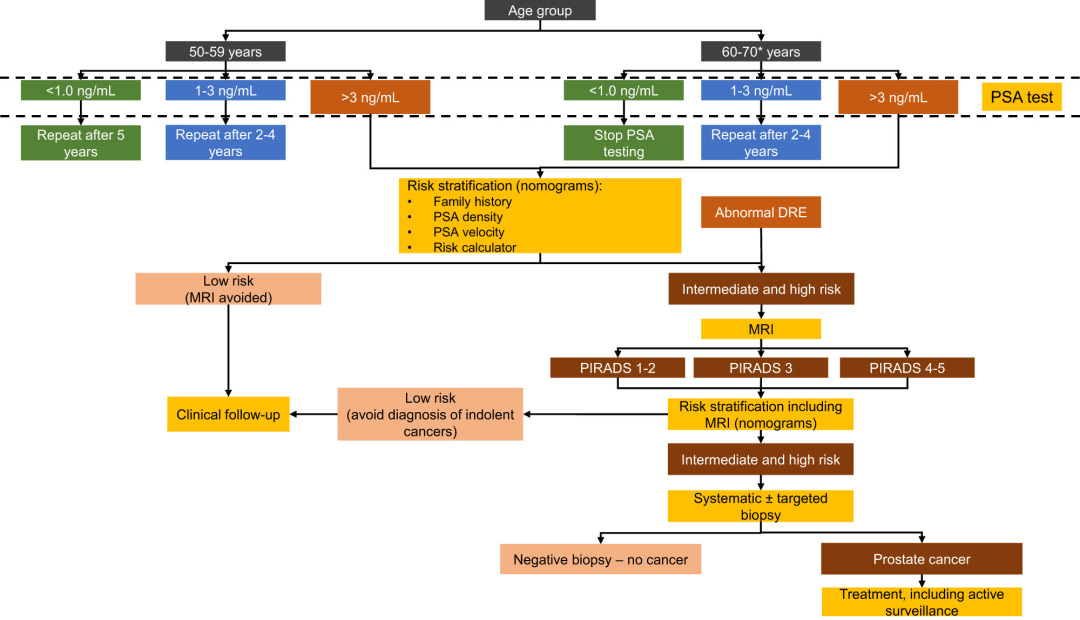 个体化管理主要包括个体化筛查,个体化治疗,个体化随访三个方面。在个体化筛查方面,需要更加个体化的评估,以减少过度诊断及治疗。EAU建议根据前列腺癌风险分层进行个体化筛查[2]。依据中国前列腺癌筛查与早诊早治指南,国家癌症中心指南推荐高风险人群进行PSA筛查。将预期寿命10年以上且符合下列条件之一的男性:年龄60~74岁;年龄≥45岁且有前列腺癌家族史;年龄≥40岁且携带BRCA2基因突变,归类为前列腺高风险人群。在充分知情同意的基础上行血清PSA检测,如PSA≤4.0 ng/ml,每2年监测1次及随访。如两次PSA>4.0 ng/ml,进一步临床检查干预和随访。