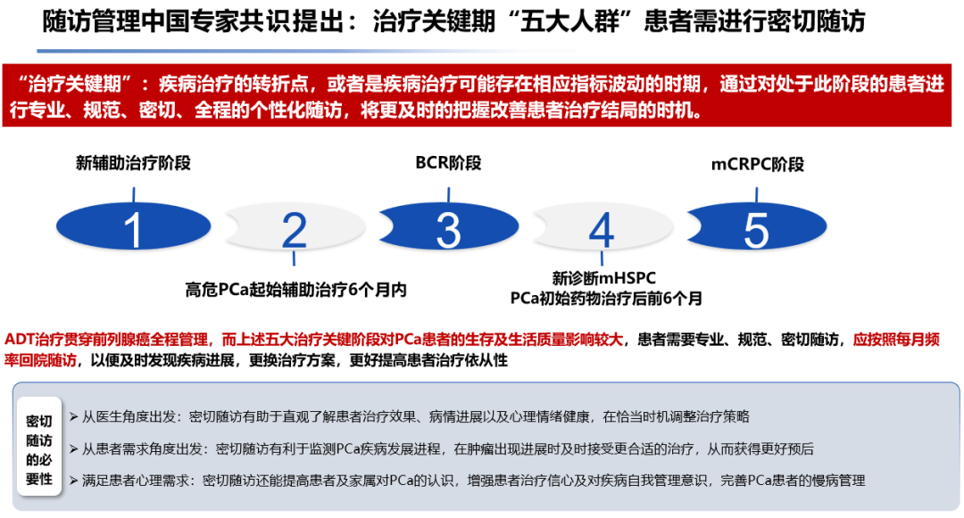中国前列腺癌研究协作组(CPCC)于2024年4月发布了《前列腺癌药物去势治疗随访管理中国专家共识》[3]。该共识首次提出“治疗关键期”概念,明确定义了五大人群:即新辅助治疗阶段,高危前列腺癌起始辅助治疗6个月内,生化复发阶段,mHSPC初始药物治疗后前6个月,mCRPC阶段患者。共识强调对于前列腺癌患者生活质量的关注和随访,倡导“治疗关键期”人群需要密切随访的治疗理念。“治疗关键期”对前列腺癌患者的生存及生活质量影响较大,患者需要专业、规范、密切随访,应按照每月频率回ADT治疗医院随访,以便及时发现疾病进展,更换治疗方案,更好提高患者治疗依从性。