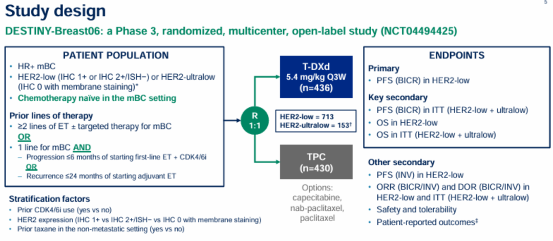 DB-04研究[1]入组患者为内分泌治疗进展且接受过1~2线化疗的HER2低表达(IHC2+且ISH-,或IHC1+)转移性乳腺癌,无论是总体人群还是HR+患者均有显著的无进展生存期(PFS)和总生存期(OS)改善。而DB-06研究[2]入组患者相较DB-04更靠前,既往未接受过晚期化疗,仅接受过≥2线晚期ET±靶向治疗,或者CDK4/6i+ET一线治疗6个月内发生进展或辅助ET≤24个月内复发;而且涵盖了HER2低表达(IHC2+且ISH-,或IHC1+)和HER2超低表达(0<IHC<1+)患者。入组患者随机接受T-DXd(5.4 mg/kg Q3W)或研究者选择的化疗(TPC,卡培他滨、紫杉醇、白蛋白结合型紫杉醇)。研究的主要终点是经盲法独立中心(BICR)评估的HR+/HER2低表达患者的PFS。
