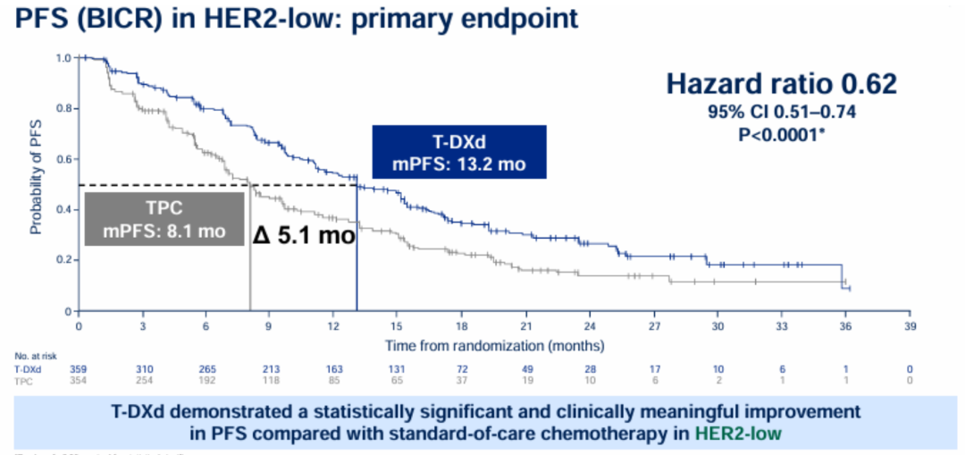 截至2024年3月18日,共入组866例患者(HER2低表达,n=713;HER2超低表达,n=153);其中90.4%的患者既往接受过CDK4/6抑制剂治疗。TPC组患者的化疗方案比例,卡培他滨为59.8%,白蛋白结合型紫杉醇为24.4%,紫杉醇为15.8%。