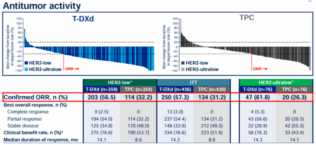 在疗效方面,HER2低表达(56.5%vs 32.2%)、HER2超低表达(61.8%vs 26.3%)和ITT人群(57.3%vs 31.2%)中T-DXd组的ORR均有不同幅度的提升。