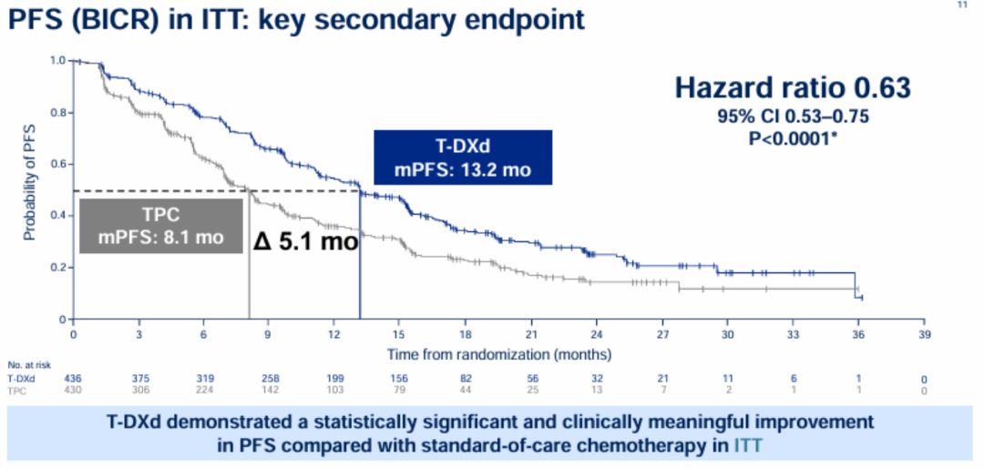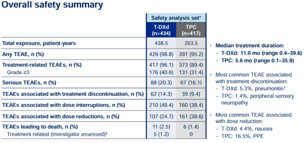 在安全性方面,T-DXd组≥3级治疗相关不良事件(TRAE)发生率为40.6%,TPC组为31.4%。在接受T-DXd治疗的患者中,有49例(11.3%)发生了间质性肺病/非感染性肺炎(ILD/p),但大多数为1/2级事件(3/4级事件率为0.7%,5级事件率为0.7%);TPC组有1例ILD/p事件(0.2%,为2级)。