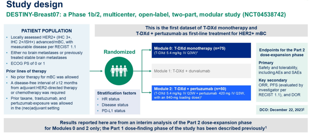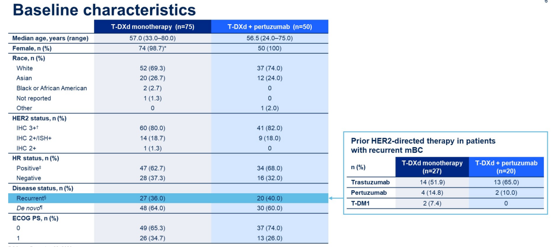 DB-07是一项两阶段、多模块的1/2期研究[5],旨在探讨基于T-DXd的不同联合方案用于HER2+ABC治疗的疗效和安全性。本次ASCO大会报道了T-DXd单药(5.4 mg/kg Q3W)或联合帕妥珠单抗(420 mg IV Q3W,负荷剂量840mg)作为HER2+ABC一线治疗的模块。T-DXd组和T-DXd+帕妥珠单抗组分别有75例和50例患者;分别中位随访19.2个月和20.6个月,两组中位年龄均为57岁。