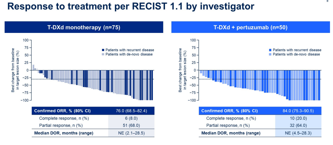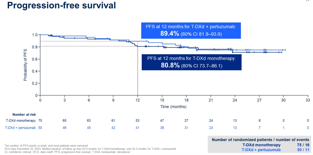 在疗效方面,T-DXd组和T-DXd+帕妥珠单抗组确认的ORR分别为76.0%和84.0%,其中CR率和PR率分别为8.0%和68.0%、20.0%和32.0%。12个月PFS率分别为77.3%和89.4%。