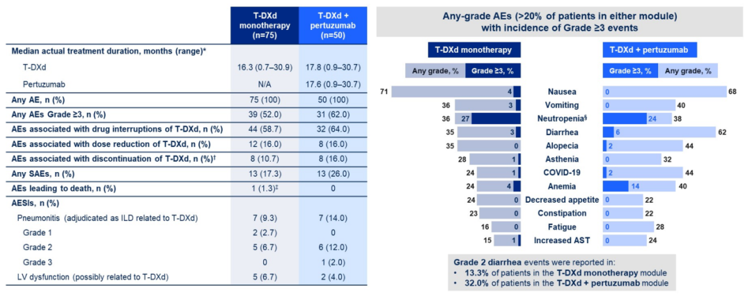 在安全性方面,最常见的不良事件是恶心,T-DXd组和T-DXd+帕妥珠单抗组的发生率分别为70.7%和68.0%,≥3级恶心分别为4.0%和0%;两组的腹泻发生率分别为34.7%和60.0%,≥3级腹泻分别为2.7%和6.0%;均没有报告≥4级的恶心或腹泻事件;两组分别有6例(8.0%)和5例(10.0%)患者报告了与药物相关的间质性肺病(ILD)/非感染性肺炎,而且均为≤2级的轻度不良事件。T-DXd组报告了1例与治疗无关的死亡事件(急性COVID-19后综合征)。