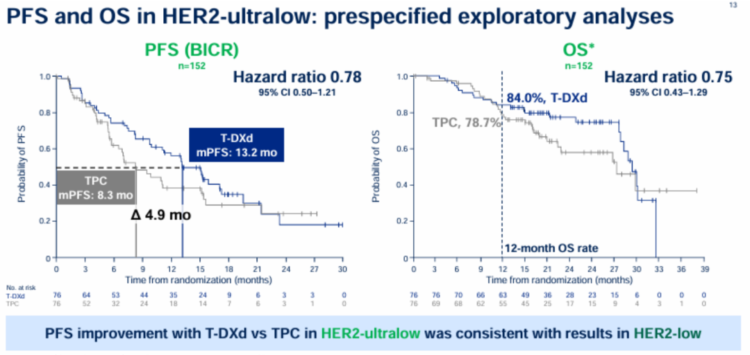 T-DXd组和TPC组的中位治疗持续时间分别为11.0个月和5.6个月。在首次中期分析时,OS数据尚不成熟,但已显示获益趋势,HER2低表达人群的HR为0.83(95%CI:0.66~1.05,P=0.1181;中位随访时间,18.6个月),HER2超低表达人群的HR为0.75(95%CI:0.43~1.29),ITT人群的HR为0.81(95%CI:0.65~1.00)。