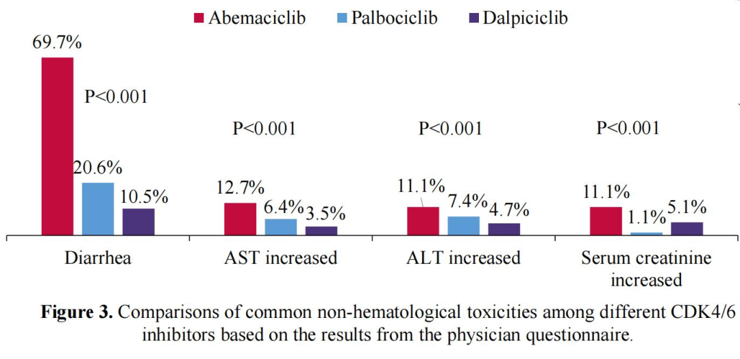 医生问卷结果显示,患者最常见的不良反应分别为白细胞减少(63.3%)、中性粒细胞计数减少(58.7%)和腹泻(36.3%)。丙氨酸氨基转氨酶(ALT)和天门冬氨酸氨基转移酶(AST)升高的发生率分别为9.3%和8.4%,≥3级发生比例分别为6%和6.7%。其中达尔西利组转氨酶升高的发生率最低,AST升高发生率仅有3.5%,ALT升高发生率为4.2%,均未发生大于等于3级的AE;达尔西利组腹泻发生率为10.5%,低于其他CDK4/6抑制剂(P<0.001)。