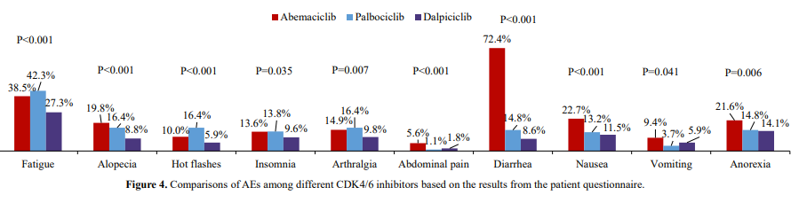 在本研究中,未观察到各种CDK4/6抑制剂在血液学毒性方面的新安全信号。而不同CDK4/6抑制剂的非血液学毒性不同。从医生的角度来看,达尔西利组腹泻和肝毒性发生率最低,哌柏西利组血清肌酐升高发生率最低。达尔西利表现出最佳的患者可感知安全性。关于生活质量的影响上,脱发引起的焦虑或是患者比较困扰的问题。