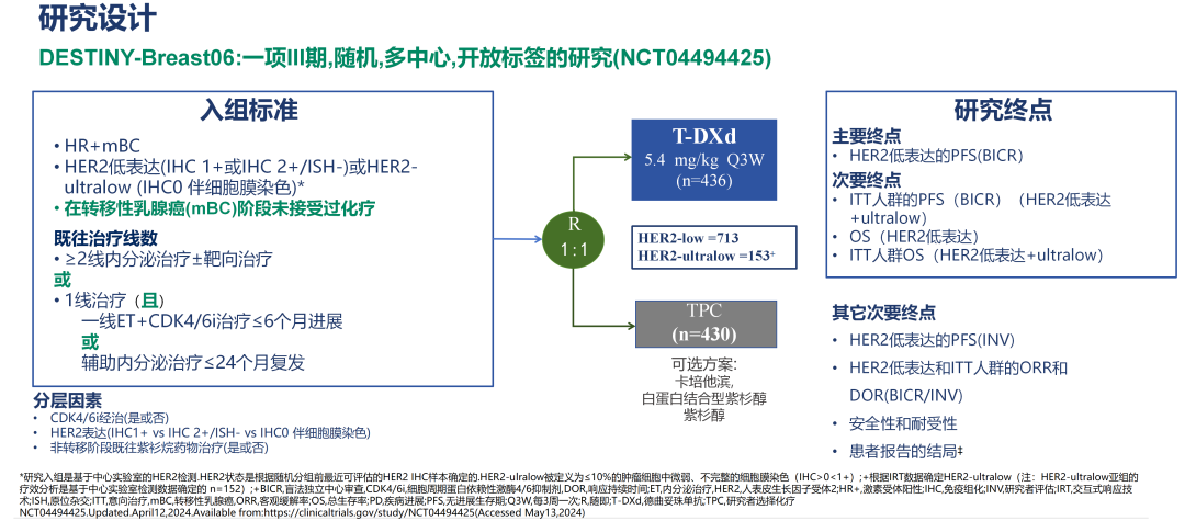• 患者人群:HR+、HER2低表达(IHC 1+或IHC 2+/ISH-)或HER2-ultralow(IHC 0伴有膜染色,即0<IHC<1+)晚期或转移性乳腺癌患者。