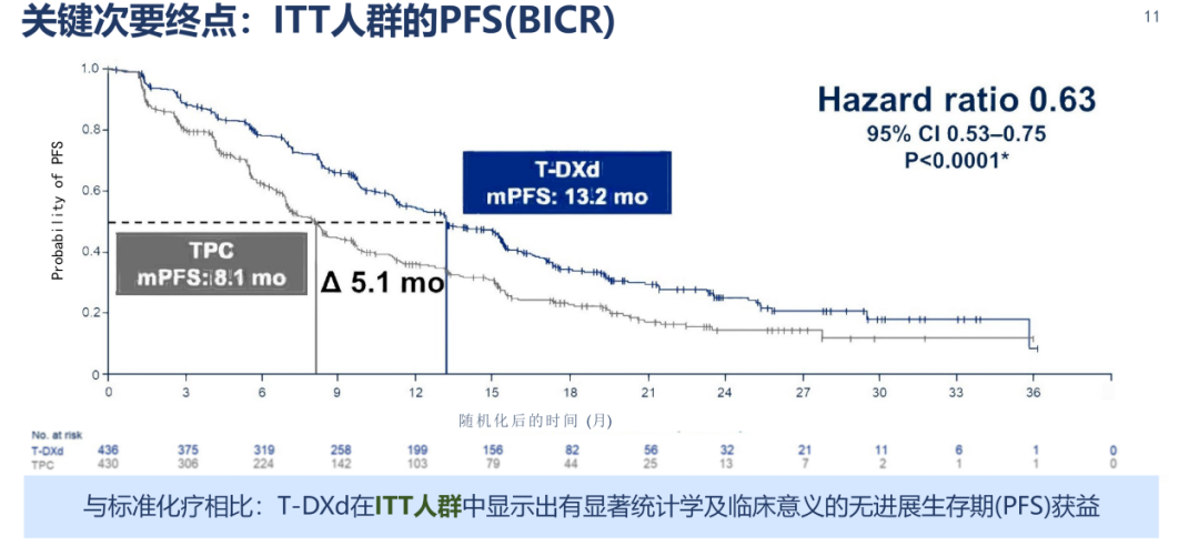 ITT人群的PFS结果与HER2低表达人群基本一致(13.2 vs.8.1个月;HR 0.63,95%CI:0.53~0.75,P<0.0001)。