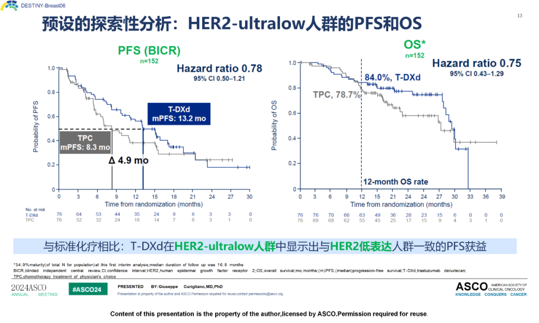 T-DXd组HER2-ultralow患者的PFS相较于TPC组延长了4.9个月(13.2 vs.8.3个月,HR 0.78,95%CI:0.50~1.21),12个月OS率也更高(84%vs.78.7%;HR 0.75,95%CI:0.43~1.29)。与TPC相比,T-DXd对HER2-ultralow患者PFS的改善与HER2低表达患者的结果一致。