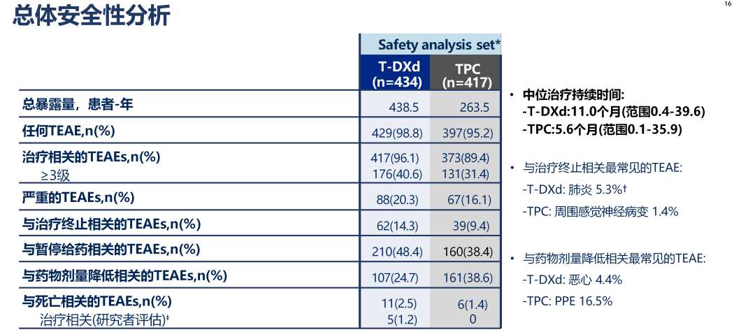 经过中位11.0个月的T-DXd治疗和中位5.6个月的TPC治疗,两组分别有40.6%和31.4%的患者发生≥3级治疗相关不良事件(TRAE)。T-DXd组49例(11.3%)出现药物相关间质性肺病/肺炎,且多为1~2级(43/49),≥3级仅有6例(1.4%)。