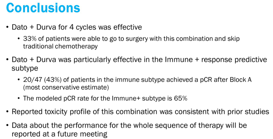 Rebecca Shatsky,et al.Rates of pathologic complete response(pCR)after datopotamab deruxtecan(Dato)plus durvalumab(Durva)in the neoadjuvant setting:Results from the I-SPY2.2 trial.2024 ASCO abstract LBA501.