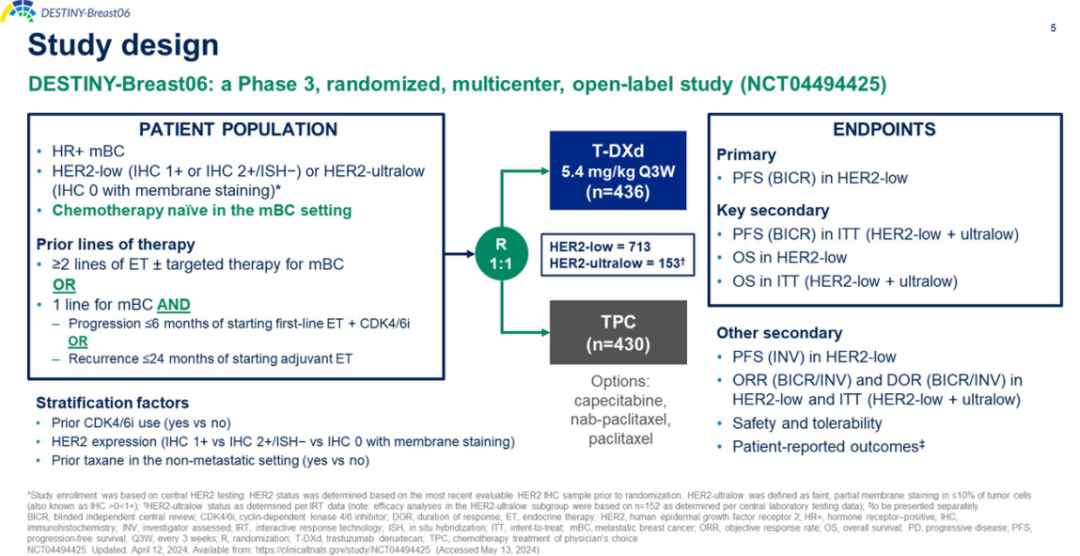 既往公布的DB-04研究,入组条件为既往接受过1线或2线化疗的HR+或HR-、HER2低表达的不可切除和/或转移性乳腺癌(mBC)患者。