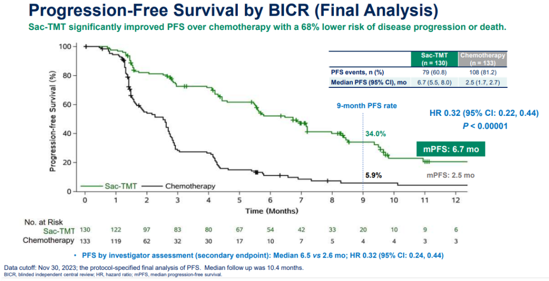 研究结果显示,BICR评估的mPFS由TPC组的2.5个月延长到芦康沙妥珠单抗组的6.7个月,(HR 0.32,95%CI:0.22~0.44,P<0.00001),OS虽然尚不成熟,但已经显示远远超过对照组,所以可以看出这是非常好的临床研究结果,也首次证实了芦康沙妥珠单抗相较于其他医生选择的化疗方案有明显的临床获益,期待这个药物早日在中国获批上市,惠及更多中国的患者。